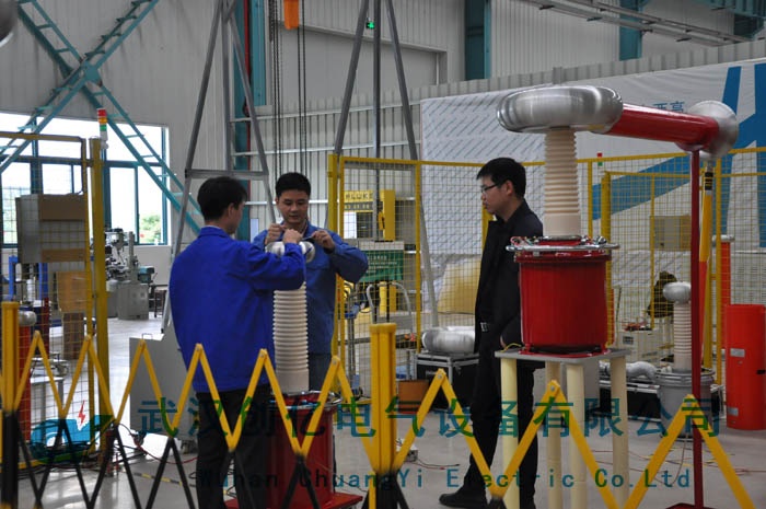 我司技術(shù)人員已經(jīng)提前將設(shè)備架設(shè)好,其中包括10/100和15/100兩臺變壓器串級,保護(hù)電阻以及控制臺設(shè)備??蛻舻诌_(dá)我司后,直接前往廠房進(jìn)行驗(yàn)收工作。