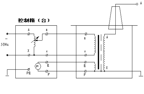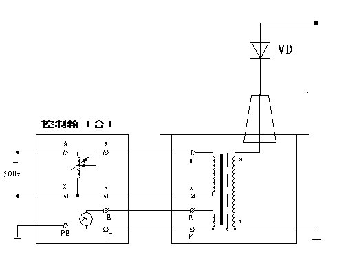 圖3:交流干式試驗(yàn)變壓器接線 2. 交直流干式試驗(yàn)變壓器:如圖4 圖中高壓輸出的上端裝有高壓硅堆,串接在高壓回路中作半波整流,以獲得直流高電壓。當(dāng)取下不接高壓硅堆時(shí),作為直流輸出狀態(tài)。