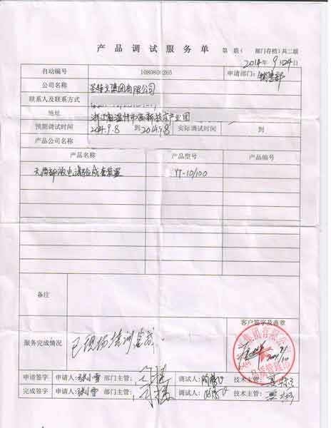 2014-10-09  浙江圣特立電氣有限公司進(jìn)行調(diào)試服務(wù),調(diào)試產(chǎn)品:CYYT-10/100無(wú)局部放電試驗(yàn)成套裝置  CYYT-10/100、無(wú)局部放電試驗(yàn)成套裝置1070420201