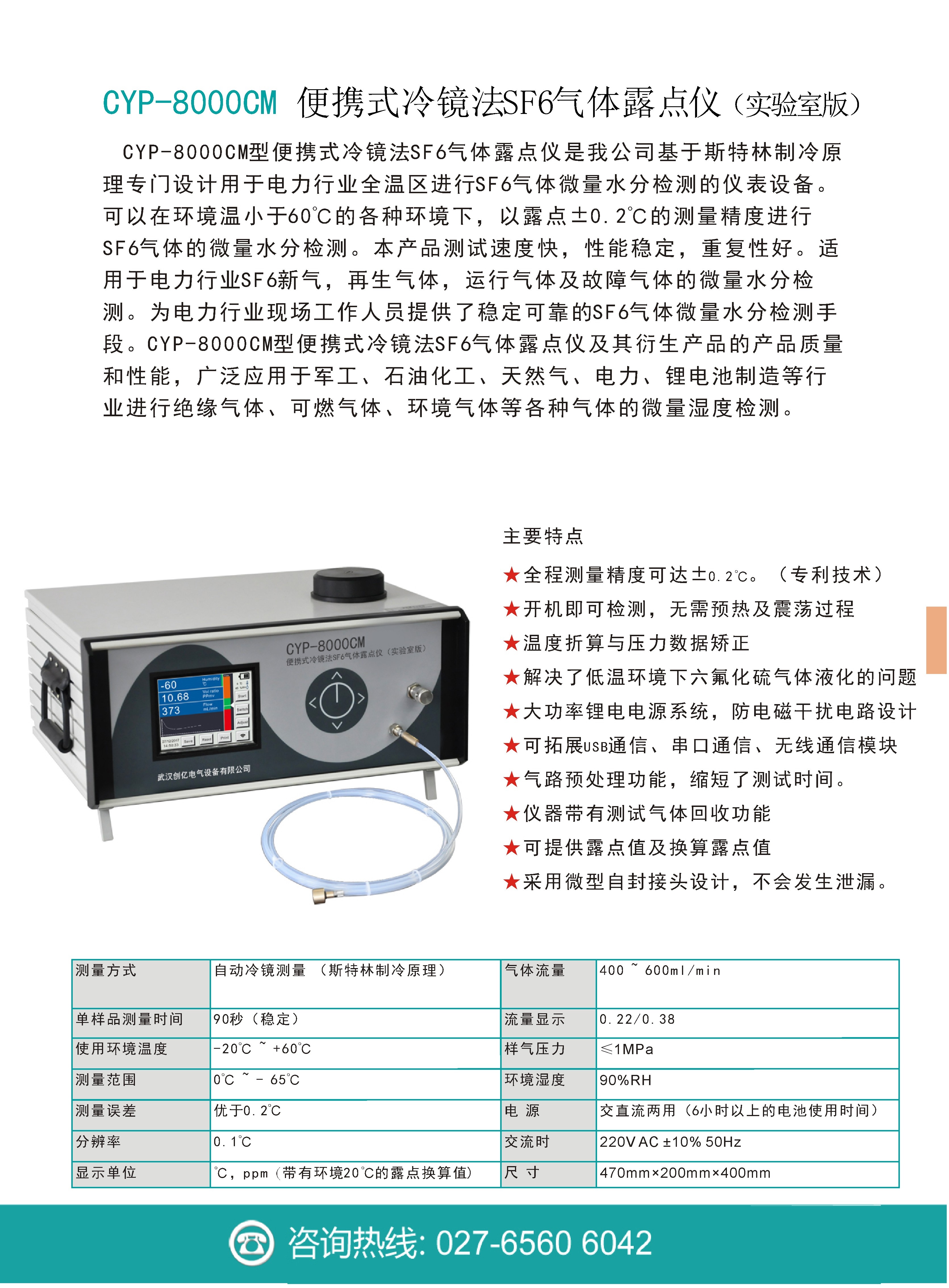 CYP-8000CM便攜式冷鏡法SF6氣體露點(diǎn)儀(實(shí)驗(yàn)室版)是創(chuàng)億電氣基于斯特林制冷原理專門設(shè)計(jì)用于電力行業(yè)全溫區(qū)進(jìn)行SF6氣體微量水分檢測(cè)的儀表設(shè)備??梢栽诃h(huán)境溫小于60℃的各種環(huán)境下,以露點(diǎn)±0.2℃的測(cè)量精度進(jìn)行SF6氣體的微量水分檢測(cè)。本產(chǎn)品測(cè)試速度快,性能穩(wěn)定,重復(fù)性好。適用于電力行業(yè)SF6新氣,再生氣體,運(yùn)行氣體及故障氣體的微量水分檢測(cè)。為電力行業(yè)現(xiàn)場(chǎng)工作人員提供了穩(wěn)定可靠的SF6氣體微量水分檢測(cè)手段。便攜式冷鏡法SF6氣體露點(diǎn)儀及其衍生產(chǎn)品以其優(yōu)異的產(chǎn)品質(zhì)量和性能,廣泛應(yīng)用于軍工、石油化工、天然氣、電力、鋰電池制造等行業(yè)進(jìn)行絕緣氣體、可燃?xì)怏w、環(huán)境氣體等各種氣體的微量濕度檢測(cè)。