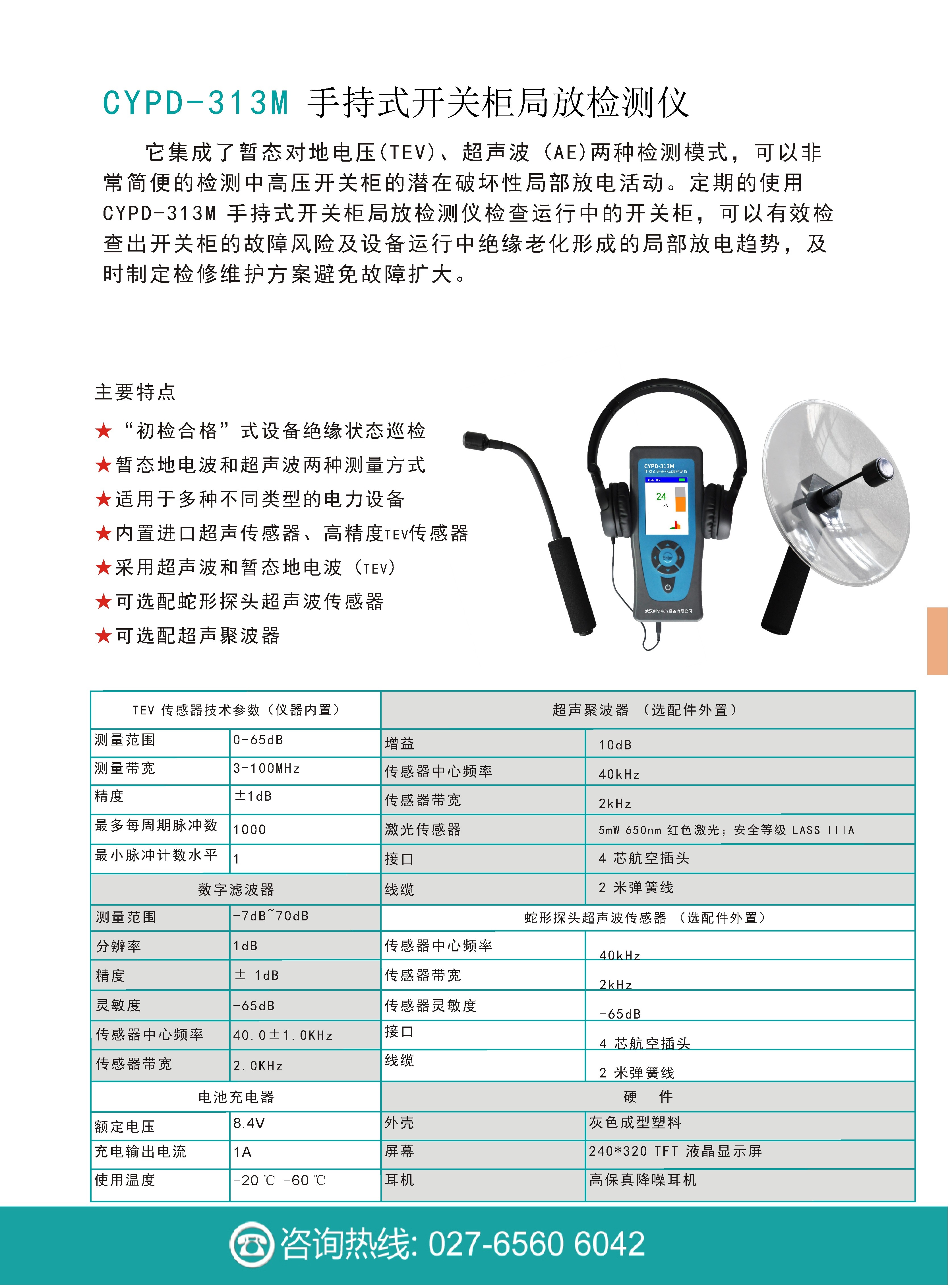 CYPD-313M手持式開關(guān)柜局放檢測儀集成了暫態(tài)對地電壓(TEV)、超聲波(AE)兩種檢測模式,可以非常簡便的檢測3~66kV中高壓開關(guān)柜的潛在破壞性局部放電活動。定期的使用局部放電測試儀檢查運行中的開關(guān)柜,可以有效檢查出開關(guān)柜的故障風(fēng)險及設(shè)備運行中絕緣老化形成的局部放電趨勢,及時制定檢修維護(hù)方案避免故障擴(kuò)大。