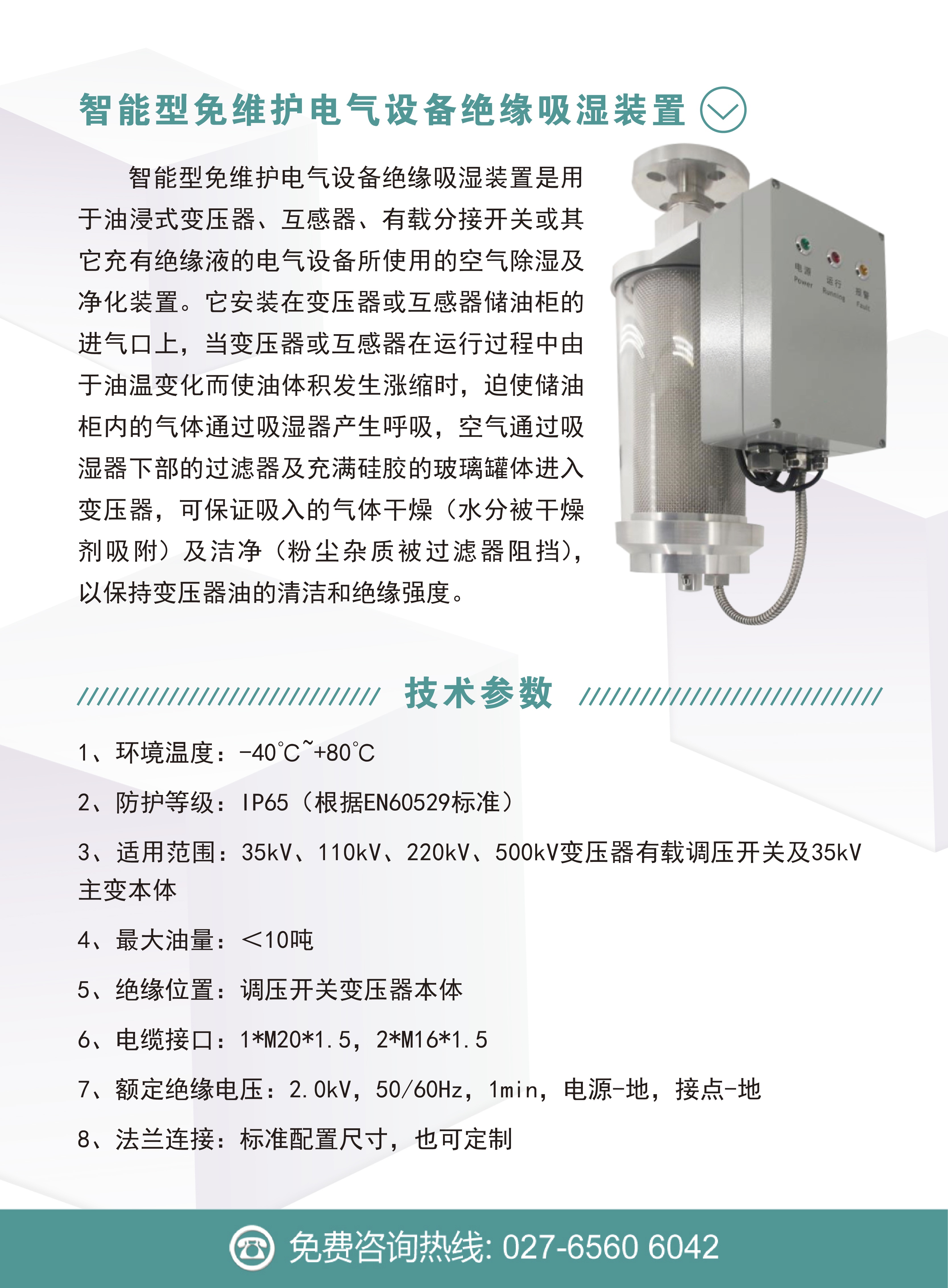 智能型免維護(hù)電氣設(shè)備絕緣吸濕裝置是用于油浸式變壓器、互感器、有載分接開關(guān)或其它充有絕緣液的電氣設(shè)備所使用的空氣除濕及凈化裝置。它安裝在變壓器或互感器儲(chǔ)油柜的進(jìn)氣口上,當(dāng)變壓器或互感器在運(yùn)行過程中由于油溫變化而使油體積發(fā)生漲縮時(shí),迫使儲(chǔ)油柜內(nèi)的氣體通過吸濕器產(chǎn)生呼吸,空氣通過吸濕器下部的過濾器及充滿硅膠的玻璃罐體進(jìn)入變壓器,可保證吸入的氣體干燥(水分被干燥劑吸附)及潔凈(粉塵雜質(zhì)被過濾器阻擋),以保持變壓器油的清潔和絕緣強(qiáng)度。
