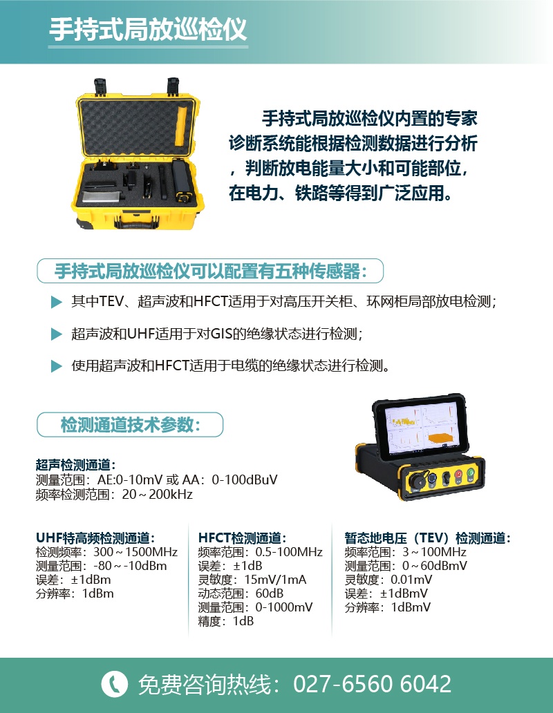 CYPD-414H手持式局放巡檢儀配置有五種傳感器,其中TEV、超聲波和HFCT適用于對(duì)高壓開關(guān)柜、環(huán)網(wǎng)柜局部放電檢測(cè);超聲波和UHF適用于對(duì)GIS的絕緣狀態(tài)進(jìn)行檢測(cè);使用超聲波和HFCT適用于電纜的絕緣狀態(tài)進(jìn)行檢測(cè)。內(nèi)置的專家診斷系統(tǒng)能根據(jù)檢測(cè)數(shù)據(jù)進(jìn)行分析,判斷放電能量大小和可能部位,在電力、鐵路等得到廣泛應(yīng)用。